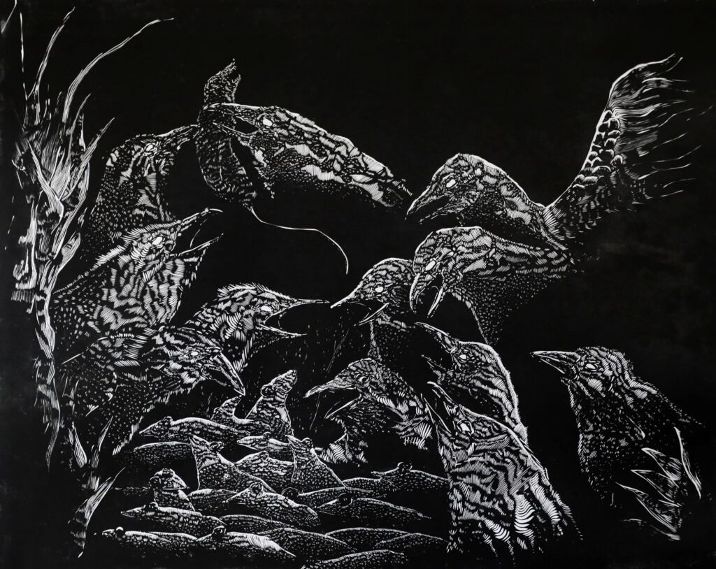Jakub uspěl s velkoformátovým linorytem s názvem Havrani, ve kterém využívá motiv hejna k zachycení proměny chování v reakci na vnější okolnosti a krizové situace. Samotný proces rytí do lina autor pojal jako paralelu k tématu transformace, kdy každé definitivní rozhodnutí rydlem zanechává trvalou stopu a skrze kontrast světla a stínu zdůrazňuje dualitu mezi klidem a napětím.